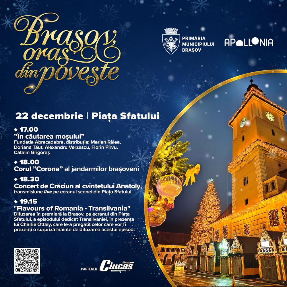 Programul de evenimente din Piața Sfatului, din această seară, se îmbogățește cu transmisiunea live a concertului de Crăciun susținut de cvintetul Anatoly, care va putea fi urmărit pe ecranul din Piața Sfatului, între orele 18:30 și 19:15.